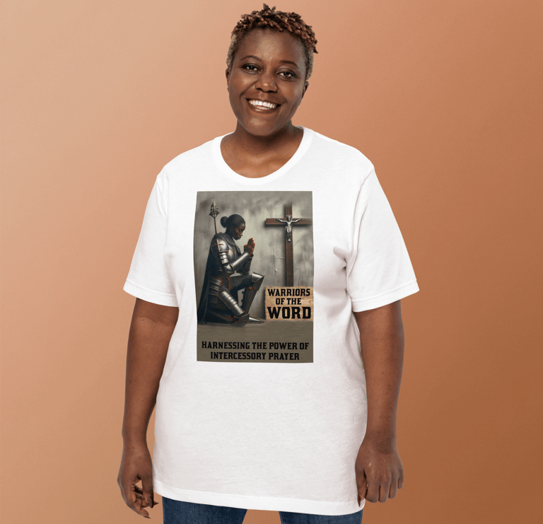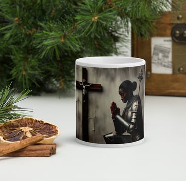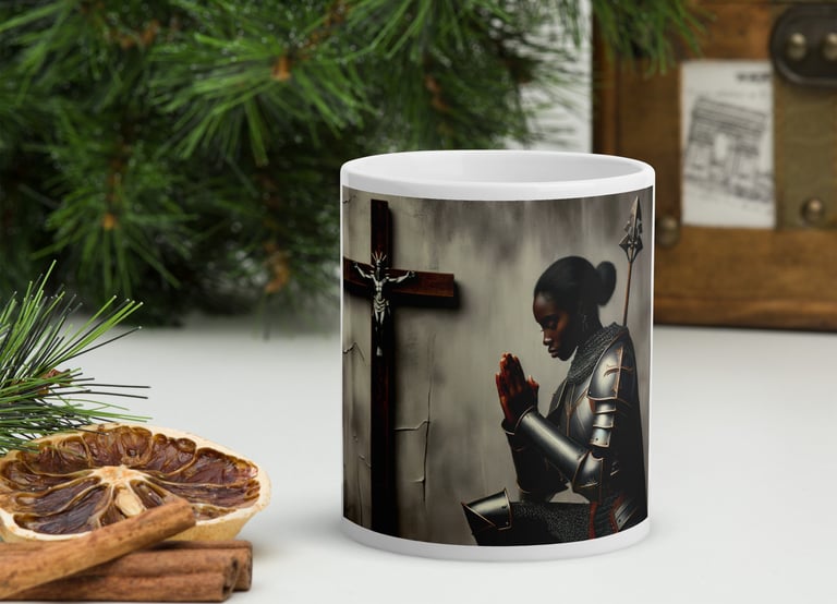 These items feature the powerful cover image from Warriors of the Word: Harnessing the Power of Intercessory Prayer — the kneeling armor-clad Black woman prayer warrior whose strength, devotion, and faith mirror the heart of every intercessor I know.